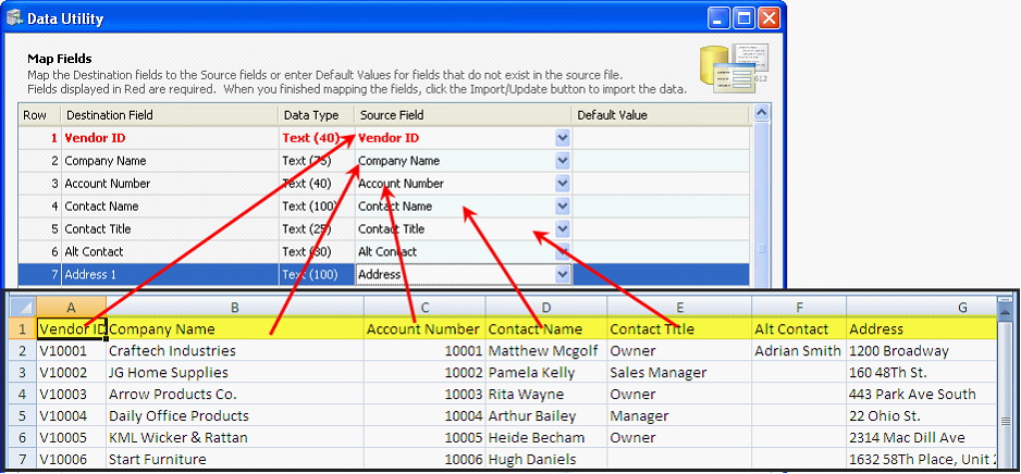 This is a sample content of the CSV file that you can import using the Data Utility form. This contains the vendor information. The row highlighted in yellow shows the field names for each detail on the vendor record.