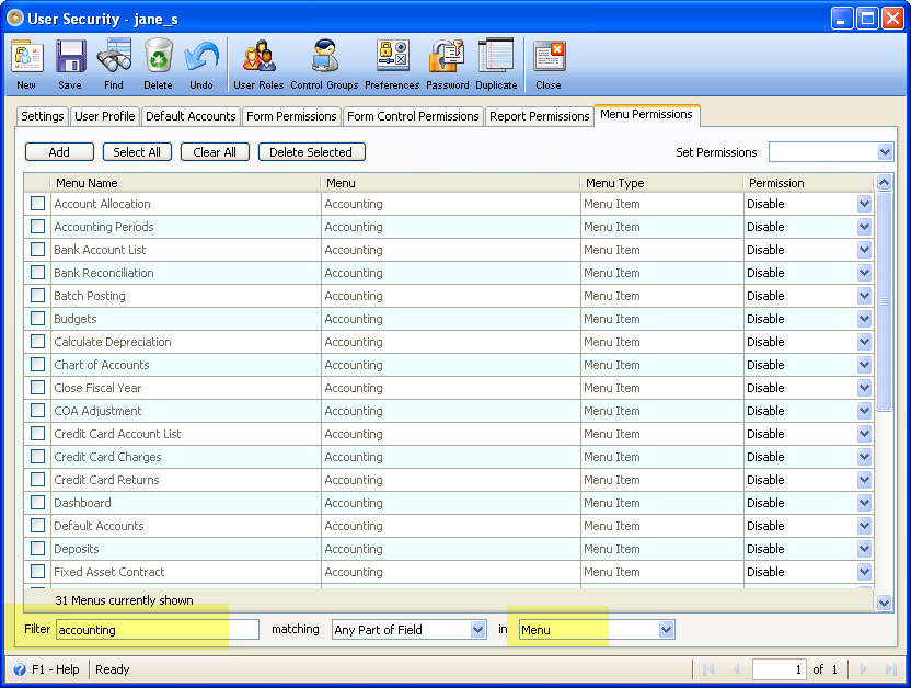 The quick search fields at the bottom of the form gives you the most flexible way to search for, or find the specific menus you are looking for. Once you have narrowed your search down to the desired menu items, you proceed with setting the menu permissions.