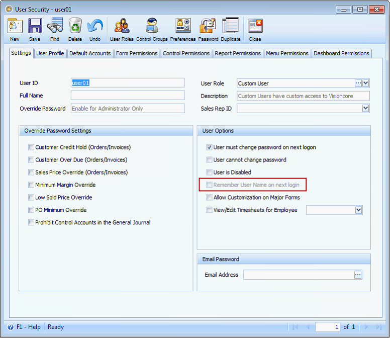 Each user is required to enter both User ID and Password when logging in to VisionCore. However, if you choose to remember the user name on login, in Security form, there is the Remember User Name on next login option that you will need to enable to remember the user name on login.