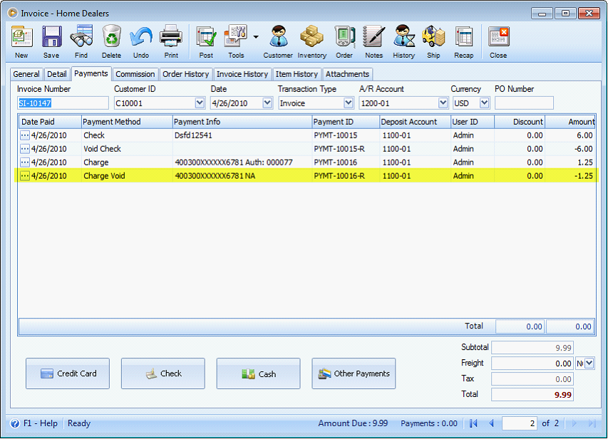 This payment line item will be shown for the void credit card payment (charge). Notice that amount is shown as negative so it zeroes out the previous credit card payment. The Payment ID and Payment info is the same as that of the original payment, plus –R for Payment ID and NA for Payment Info (without Auto number) so you get to easily reference the said void payment to its original payment transaction.